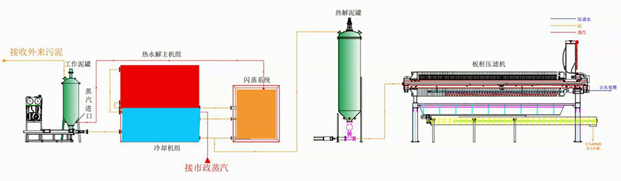 用連續加壓加溫的方法,添加少量催化劑,加速污泥中的有機物分解,使污泥中的“結合水”、“間隙水”轉化為“自由水” ,并通過機械壓濾的方式,達到含水率<30%效果。